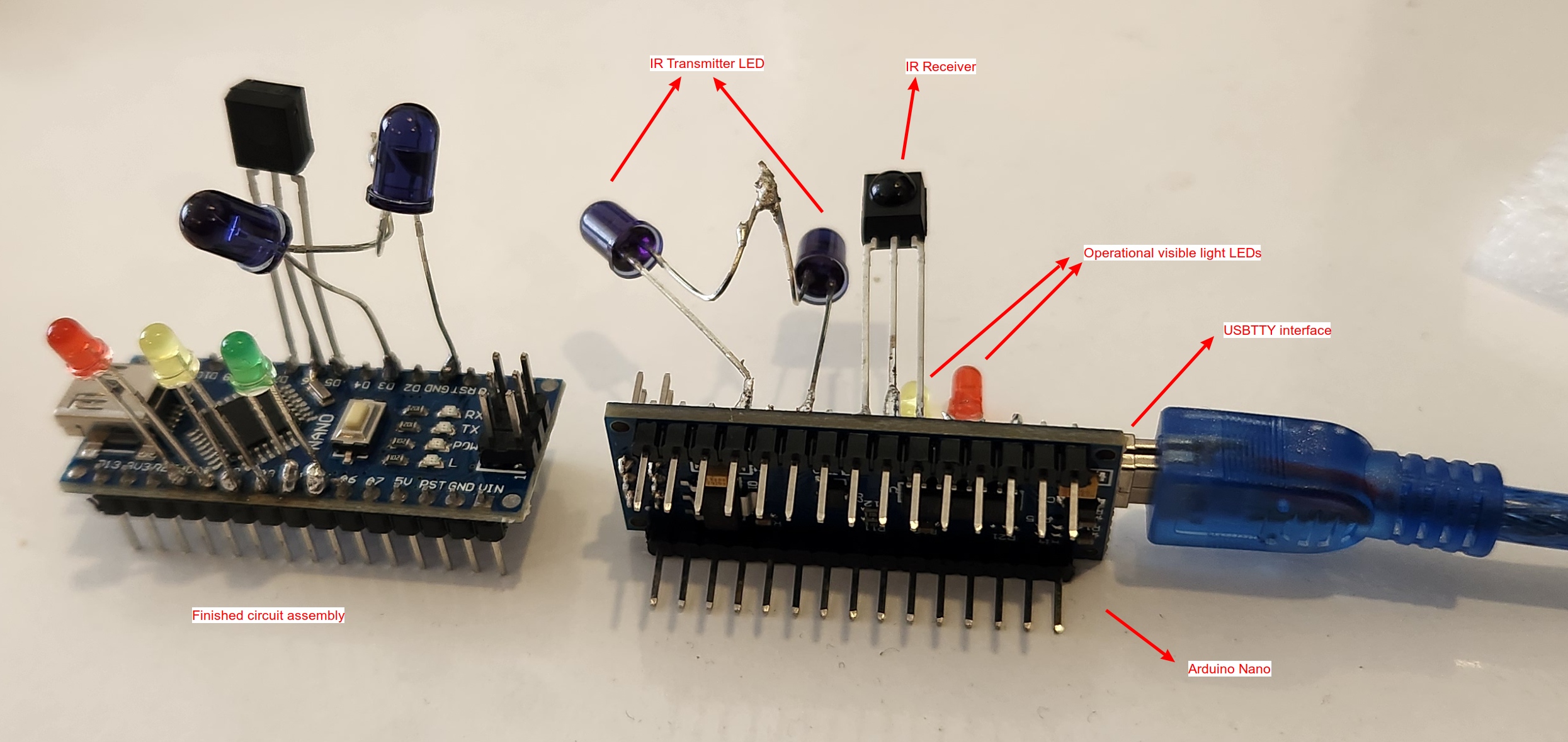 Another critical point is, original blog post used a very small resistor to avoid huge currents to flow across the IR Transmitter LEDs, but I tried even a 10ohm resistor , which has reduced signal intensity ( power ) of my IR LEDs dramatically. So I decided to connect two IR Transmitter LEDs directy to the GPIO output of Arduino-Nano, and I am happy with the performance so far.