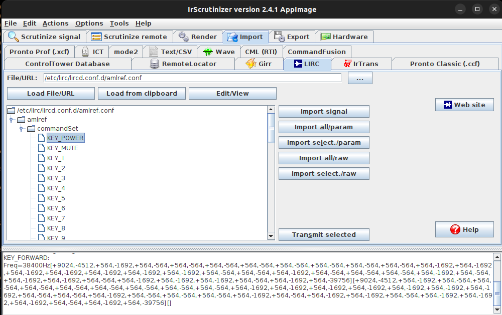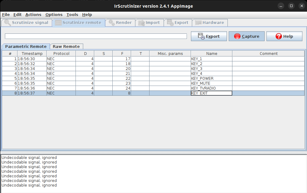 When you finish your work, press “Export” button, so it will save your LIRC compliant config file under your Documents/IrScrunitizer/lirc_…conf file.
