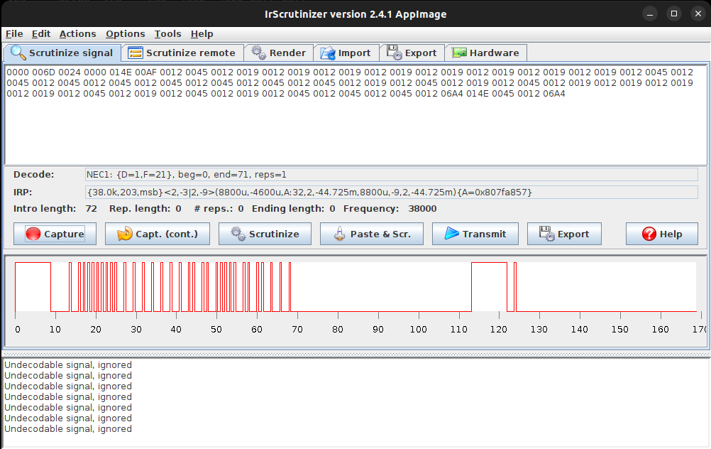 Now we can use IrScrunitizer to “learn” our IR Remote keycodes and create a “LIRC compatible” configuration file here as follows: